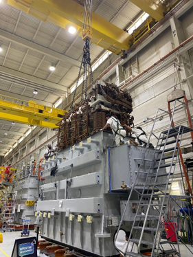 Observed the core and coil assembly being transported from the factory floor and installed into the main transformer tank.